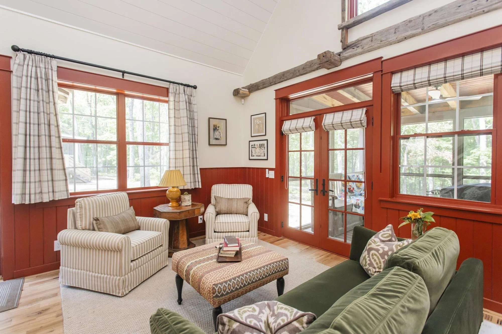 Cozy Living Area with Red-trimmed French Doors and Natural Light