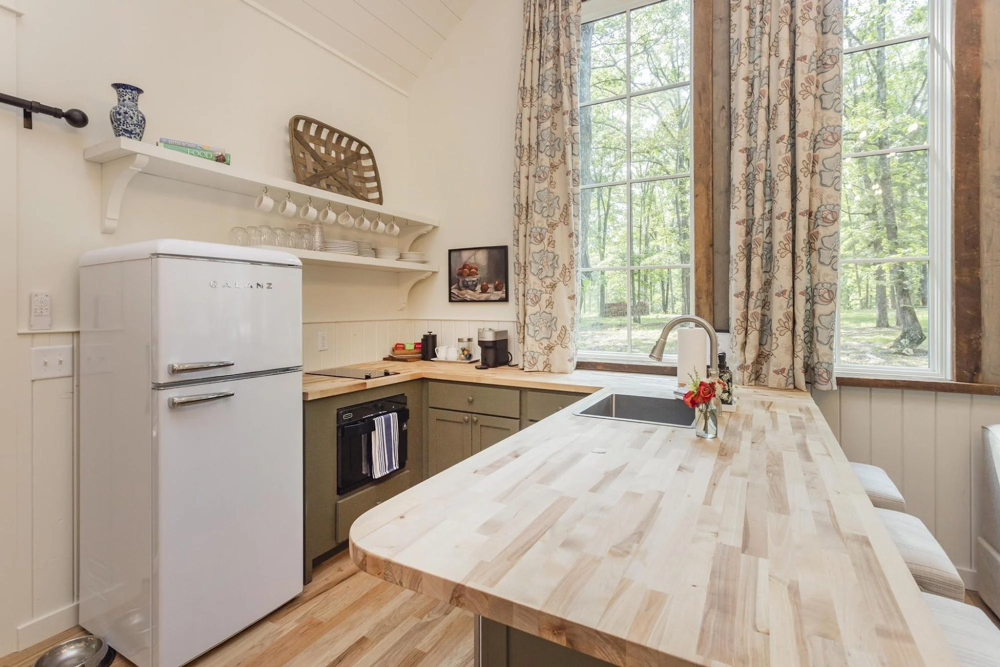 The Sharpshin Cottage offers the roomiest living space at Buckhorn Hollow. Here you will have plenty of seating for reading, relaxing, or breaking out the board games. The kitchen offers bar seating for quick bites in addition to a dining table for four if you’re in the mood for a more civilized meal. A queen bedroom with an en-suite bath on the first floor is great for early risers, while the second-floor ensuite king bedroom overlooking the treetops is a great fit for night owls. Sip your coffee on the mosquito-free screened porch while being wrapped entirely in foliage.